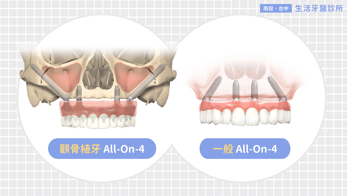 上顎後牙區牙骨高度無法容納植體,且不補骨的情況下,可利用顴骨植牙爭取更大的植體穩固性,來完成All-On-4全口重建。